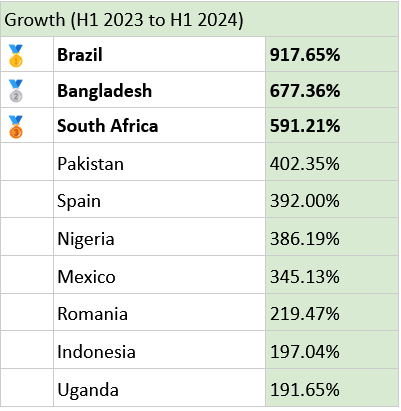 Based on client verification data, Sumsub compared internal figures from H1 2024 with the same period in 2023. The verification and anti-fraud solutions provider analysed fraud rates across a range of different fraud types and industries. Countries that experienced the highest growth rates in each were awarded a ‘gold medal,’ with trailing nations given ‘silver’ and ‘bronze.’